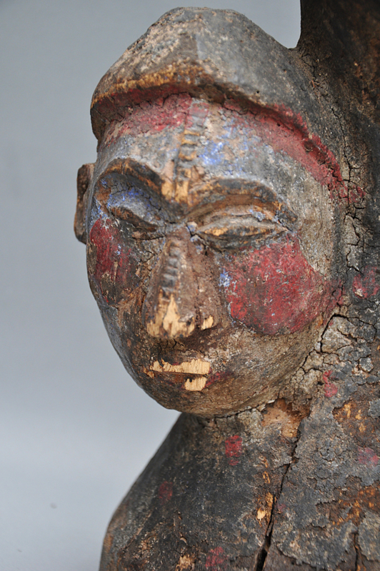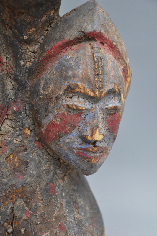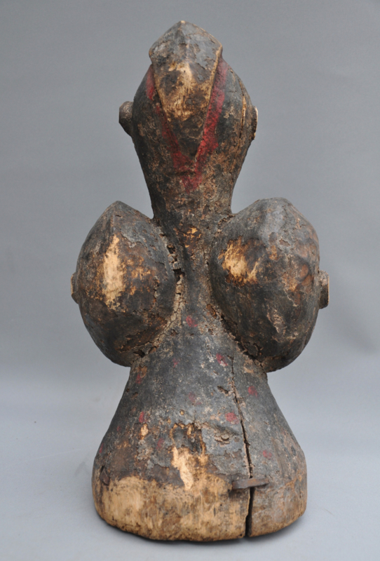 Stilistisch vallen de amandelvormige ogen en de fijne, verticale scarificaties op de voorhoofden op. De patina is van uitzonderlijke kwaliteit: een gelaagde, korstige textuur van kaolien, rood camwood-pigment en blauwe accenten getuigt van decennia aan ritueel gebruik. Een drietal authentieke, oude ijzeren krammen in de basis stabiliseert de historische krimpscheuren, wat bijdraagt aan het doorleefde en krachtige karakter van dit museale object uit het midden van de 20e eeuw.
