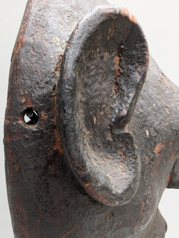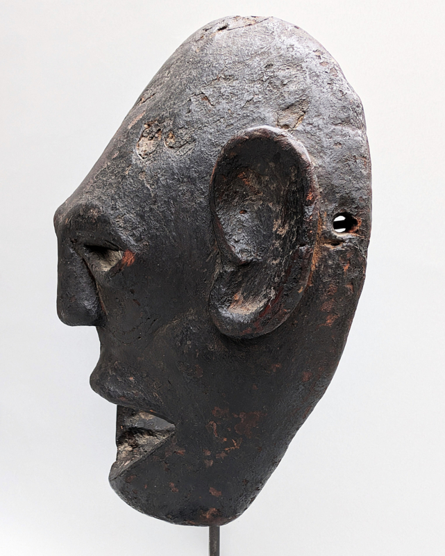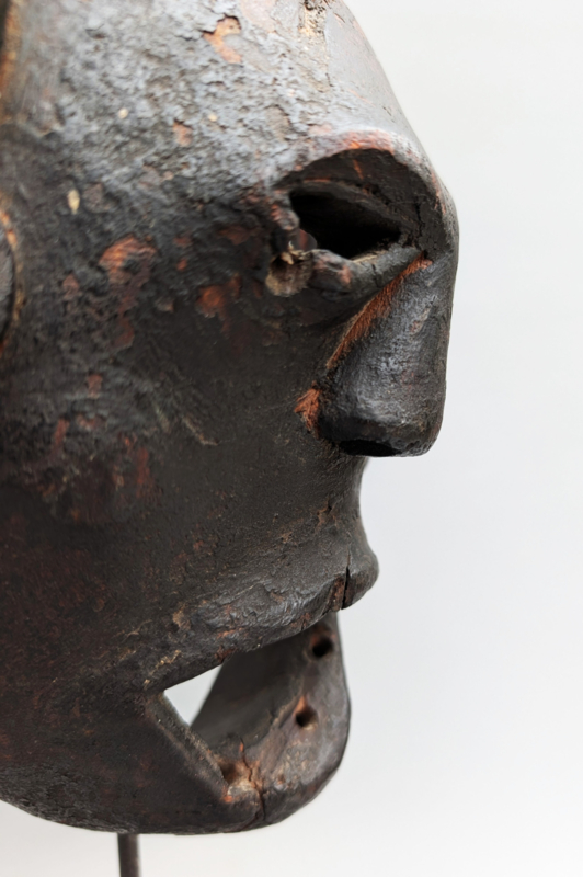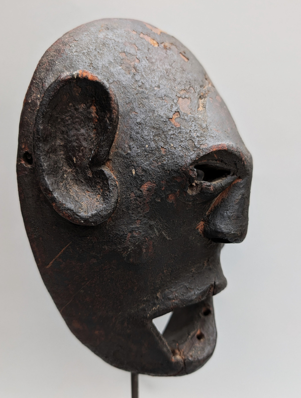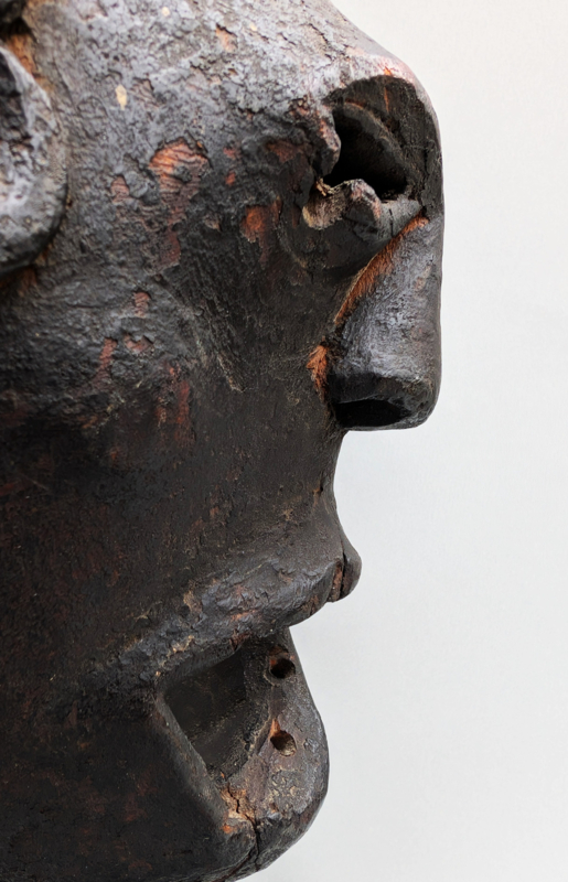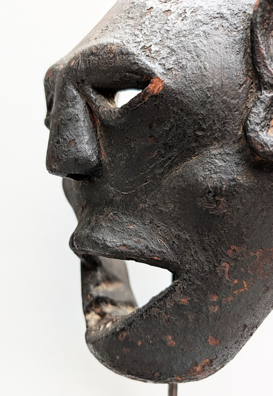 Het masker valt direct op door zijn krachtige, bijna abstracte expressie met een open mond en opvallend grote, monumentale oren. Binnen de sjamanistische context van de Himalaya hebben deze oren een cruciale functie: ze symboliseren het verhoogde vermogen van de Bombo (sjamaan) om de stemmen van de goden, voorouders en natuurgeesten te horen. Terwijl het masker de drager transformeert, fungeren de oren als spirituele antennes die de influisteringen uit de onzichtbare wereld opvangen. De diepe, korstvormige patina van roet en offergaven getuigt van generaties aan intensief ritueel gebruik.