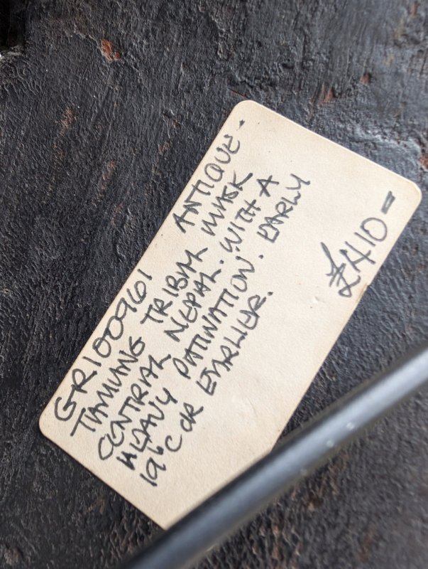 OverzichtDit indrukwekkende masker is een zeldzaam voorbeeld van de archaïsche tribale kunst uit de middengebergten van Nepal. Het object is afkomstig van de Tamang, een volk waarvan de rituele tradities diep geworteld zijn in het sjamanisme en het vroege Bön-geloof.